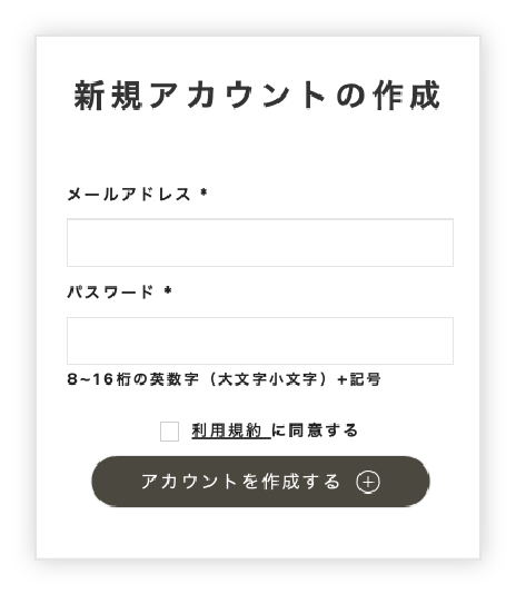 メールアドレスと任意のパスワードを入力し、「利用規約に同意する」にチェックを入れて、「アカウントを作成する」をクリックしてください。