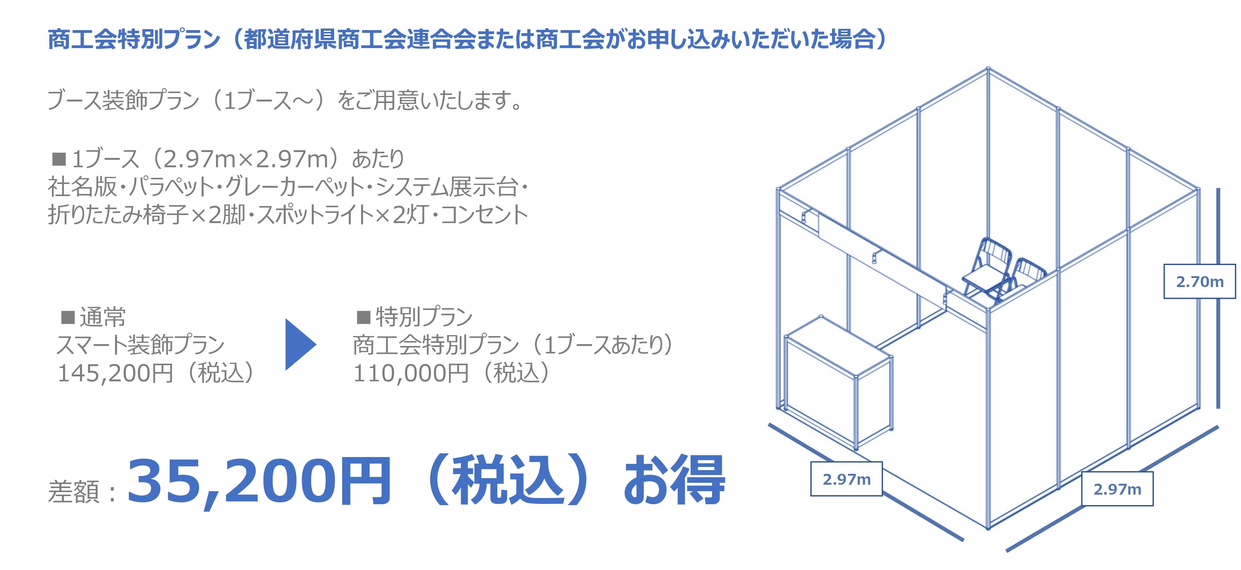 | その他 | ・設営から撤去まで一式対応。初めての出展や人手不足の方におすすめです。 ・1ブース(2.97m×2.97m)あたりの金額です。 ・2ブース出展の場合は、個別に事務局へお問い合わせください。 ・別途基礎ブース料が発生致します。料金は申込時期によって異なりますので、別添パンフレット「料金照会」欄をご参照ください。 ・対象は申込名義、窓口および出展料等請求先が「都道府県商工会連合会」または「商工会」の場合に限ります。 ・ミニブースは対象外です。 |